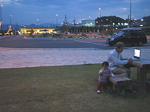 車内泊です。ここは去年(2003年)7月にオープンしたそうで、まだピカピカです。駐車場スペースの隣に芝生に休憩用のテーブルと椅子が用意されていて、夕食はそこで食べました。もかちんも芝生でゴロゴロして遊んでいました。(^^♪