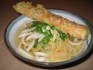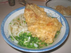 細麺と太麺の『かけうどん』をたのみ、いわしの天ぷらをのせました。